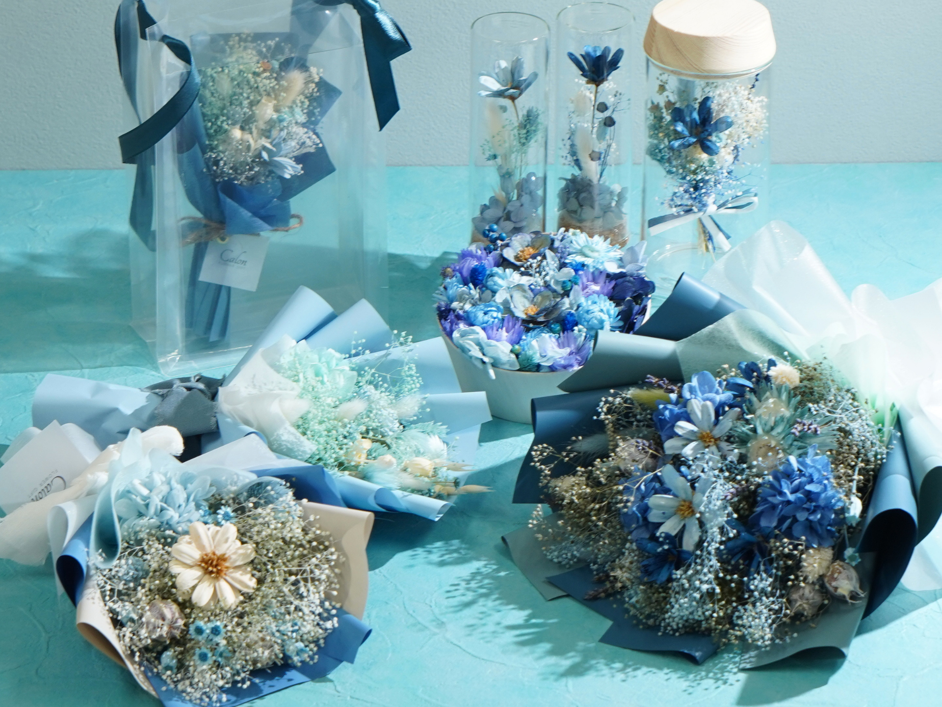ドライフラワーだからこそ実現できるカラーバリエーション。あの人の好きな色で、インテリアに合わせて、など楽しみ方は様々。