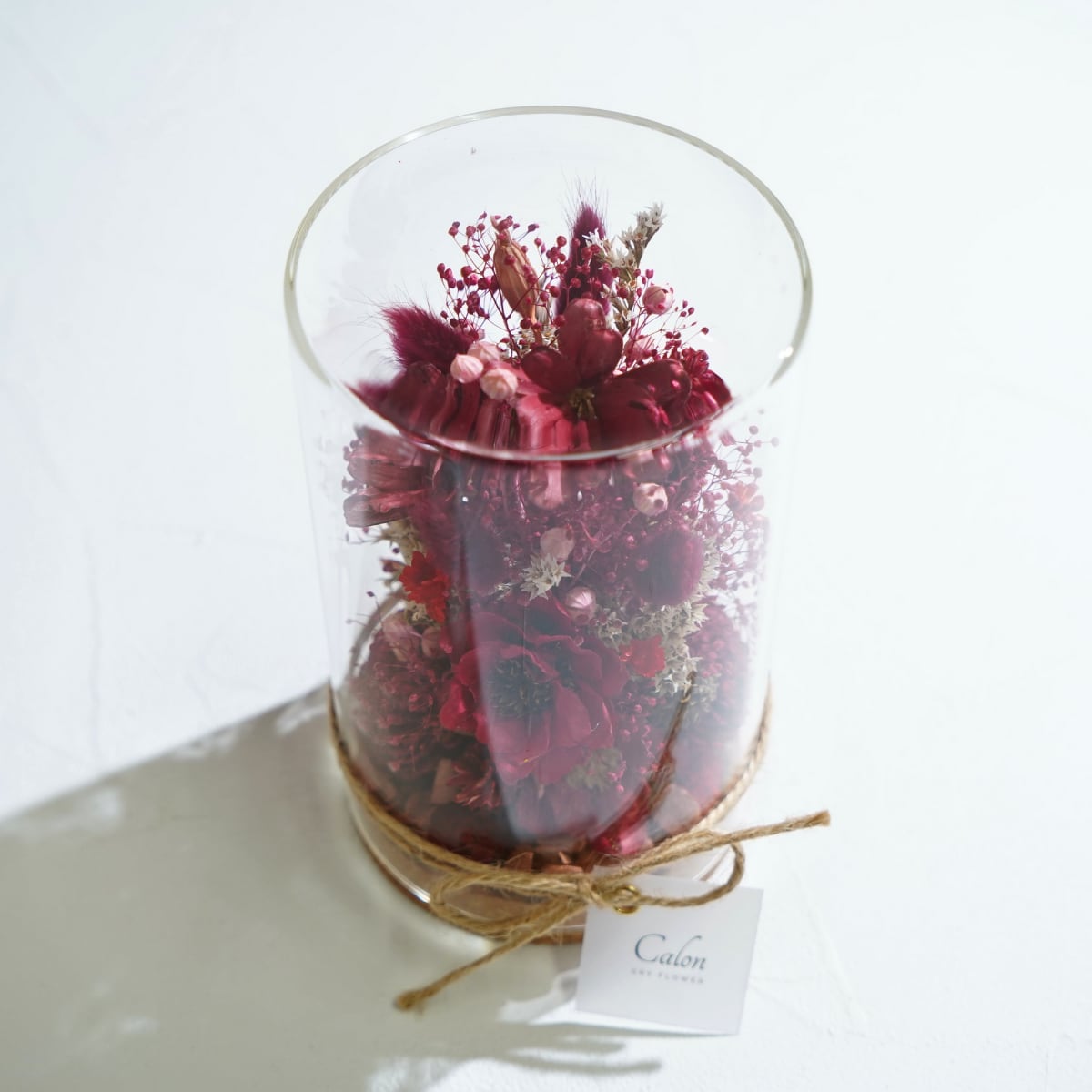 ガラスのボトルに鮮やかなドライフラワーを詰め込んだボトルフラワー。お部屋のインテリアや大切な方への贈り物にも最適です。透明ケースへお入れしてお届け致します。
