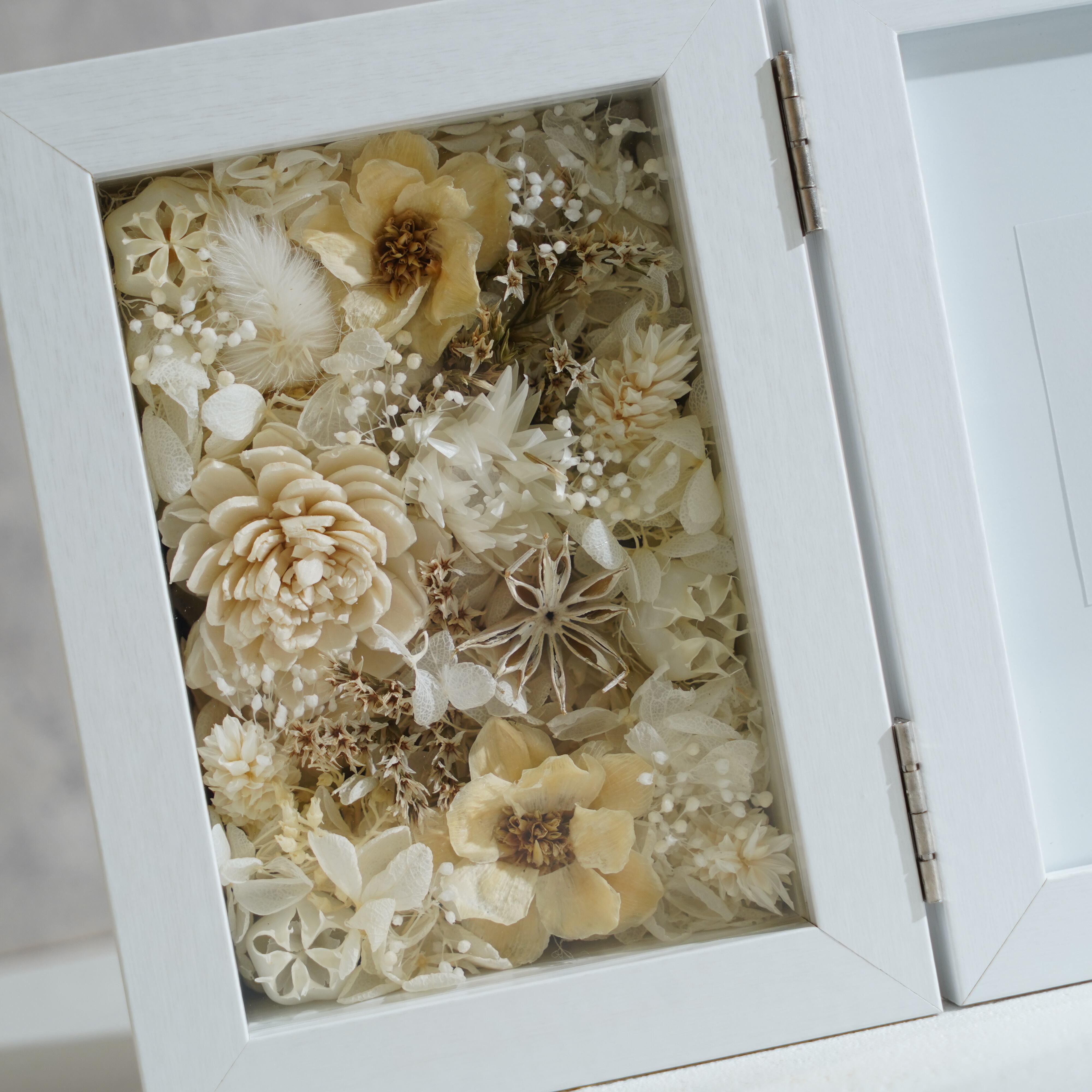 ドライフラワーとプリザーブドフラワーを一面に敷き詰めた贅沢なデザインです。