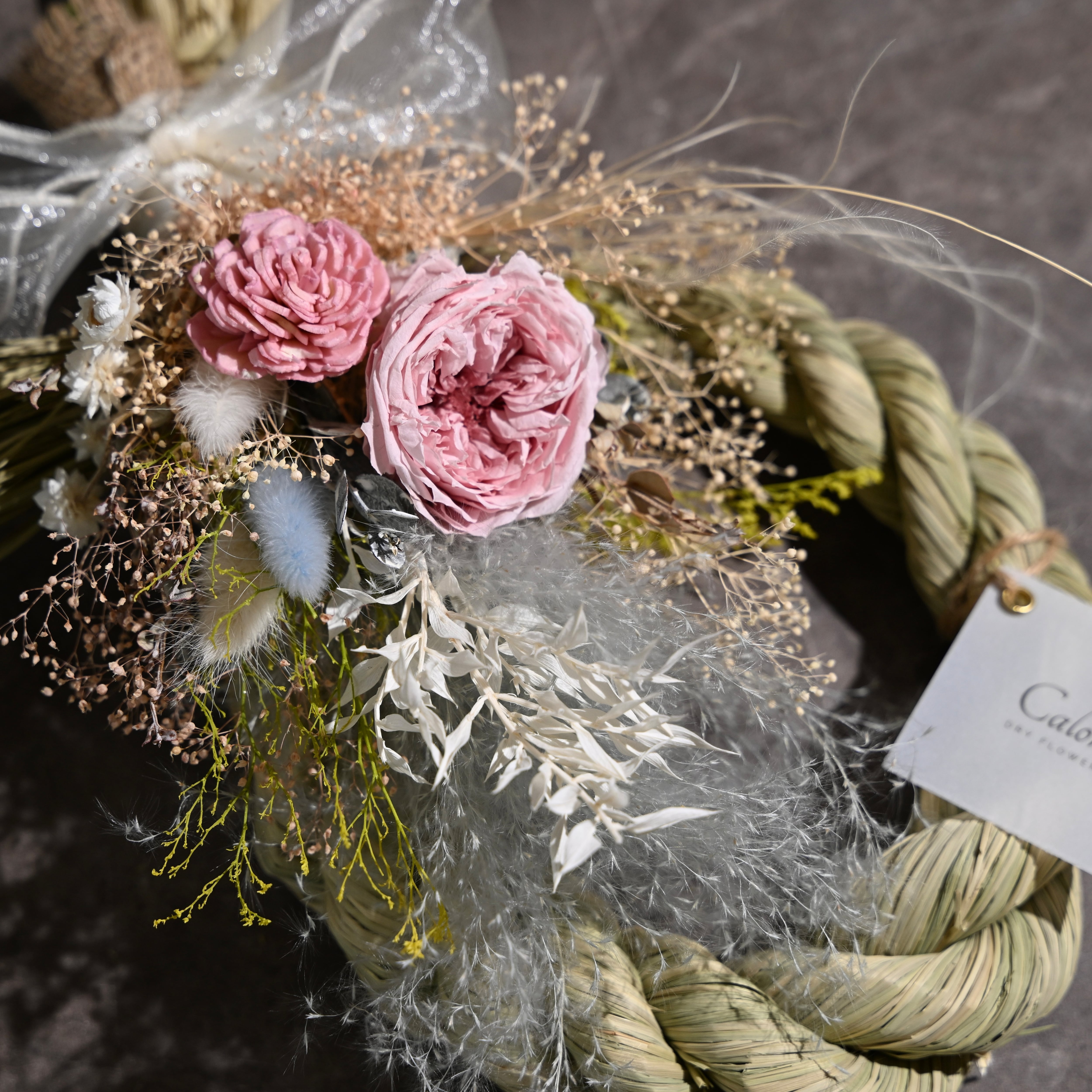 新潟県十日町市で収穫された高品質な稲わらと、Calon DRY FLOWERが厳選したドライフラワーを使用した、特別なしめ縄です。