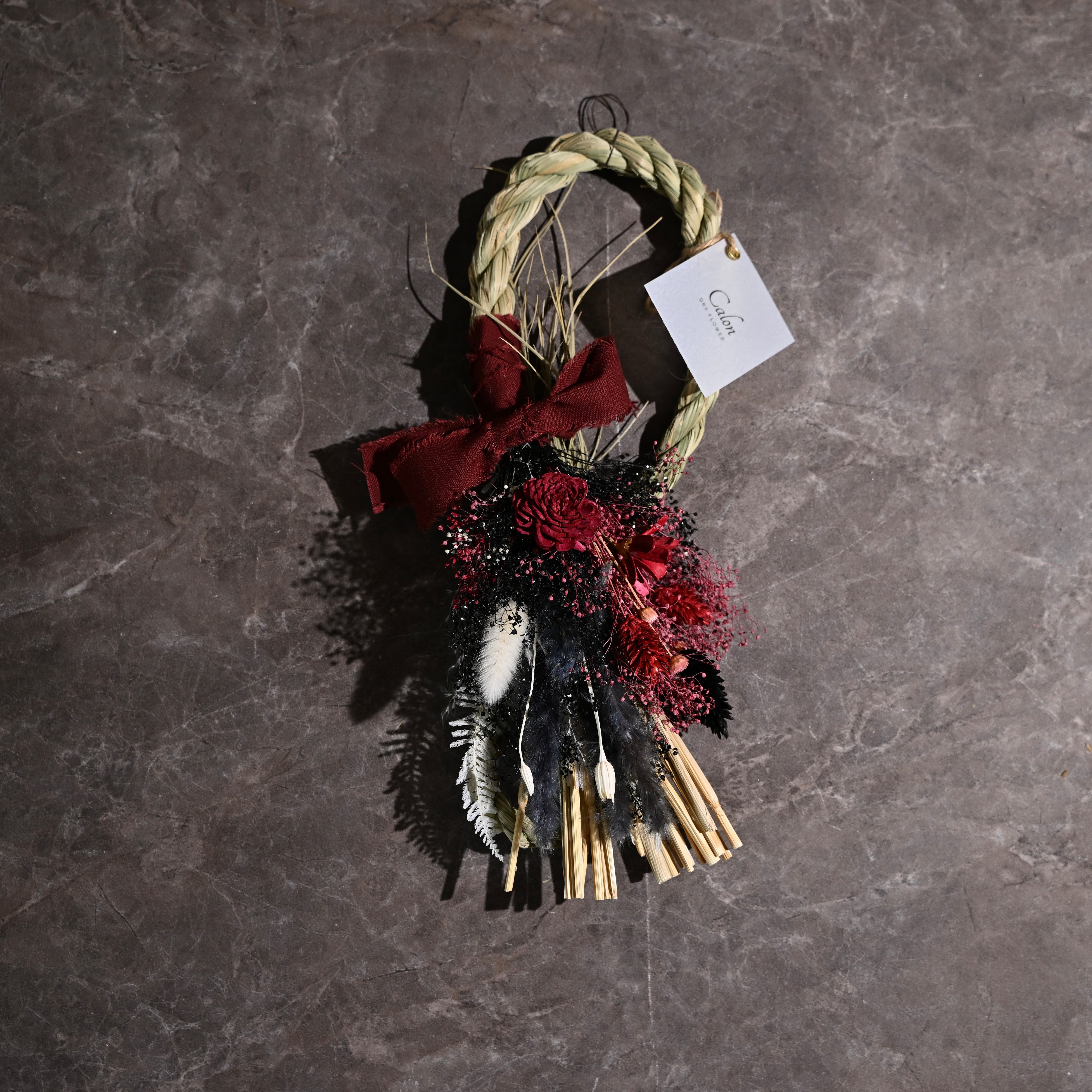 新潟県十日町市で収穫された高品質な稲わらと、Calon DRY FLOWERが厳選したドライフラワーを使用した、特別なしめ縄です。
