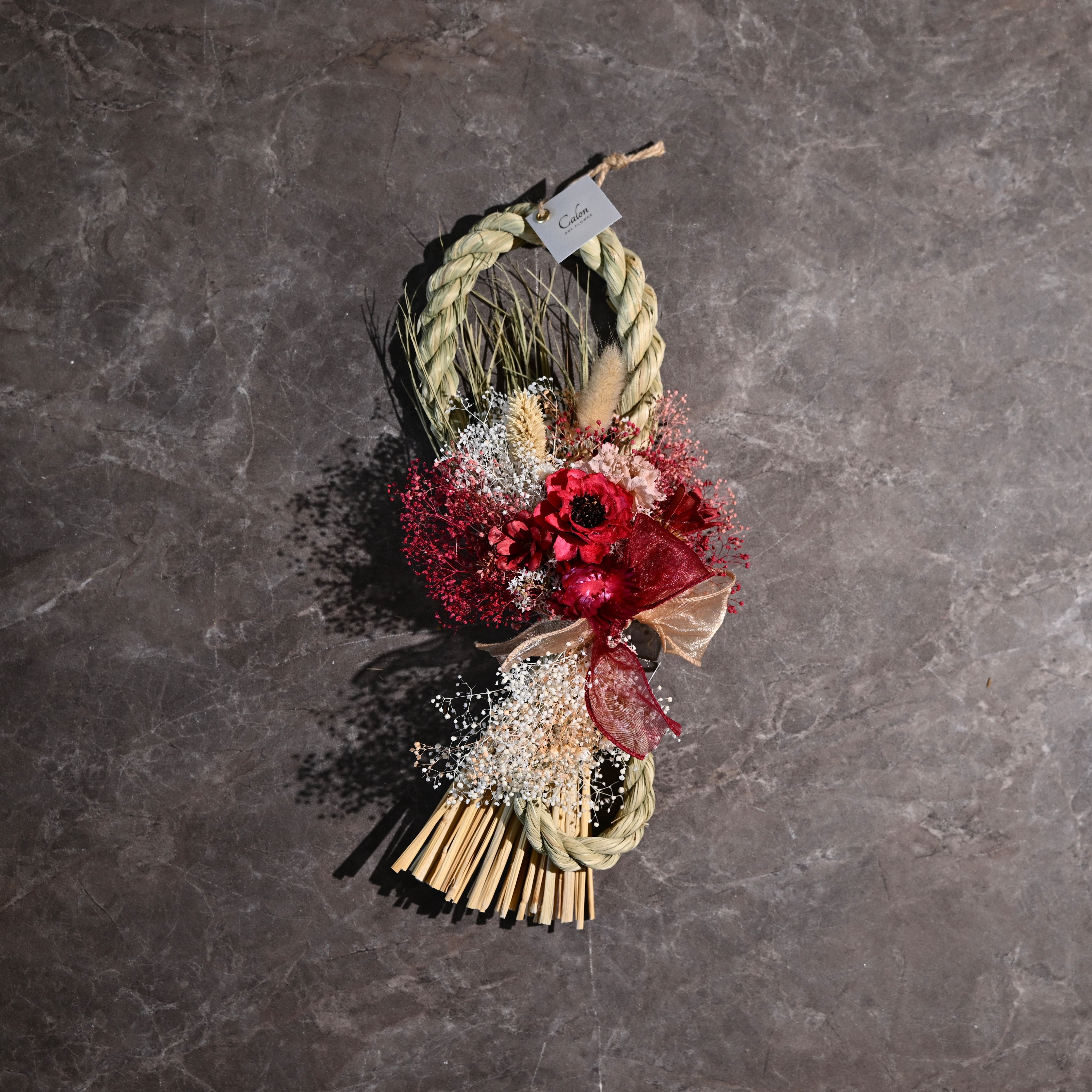 新潟県十日町市で収穫された高品質な稲わらと、Calon DRY FLOWERが厳選したドライフラワーを使用した、特別なしめ縄です。
