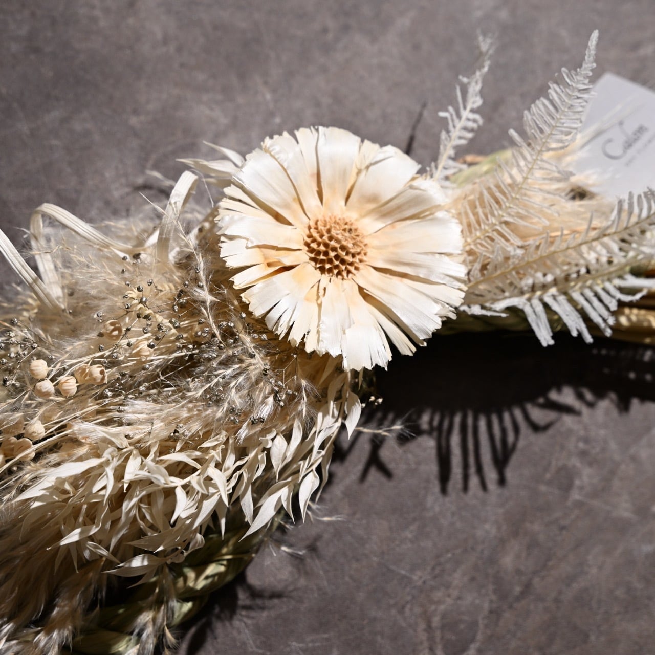 新潟県十日町市で収穫された高品質な稲わらと、Calon DRY FLOWERが厳選したドライフラワーを使用した、特別なしめ縄です。