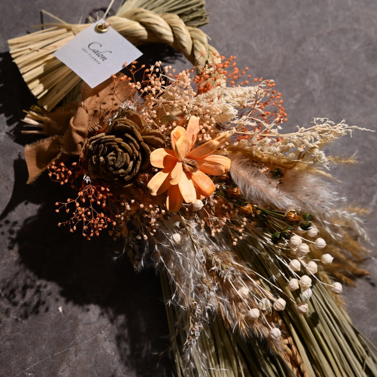 新潟県十日町市で収穫された高品質な稲わらと、Calon DRY FLOWERが厳選したドライフラワーを使用した、特別なしめ縄です。
