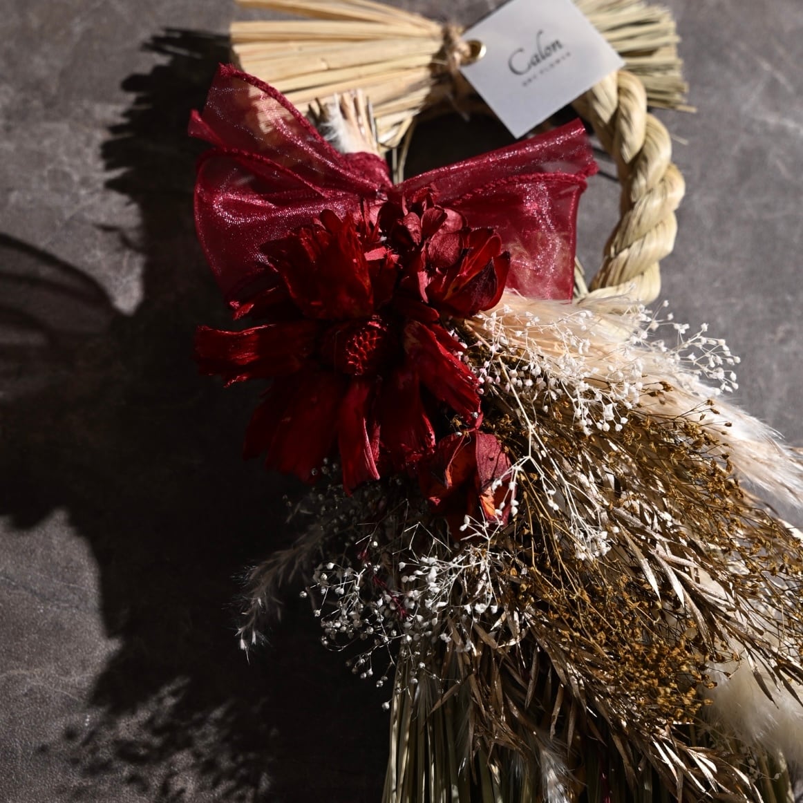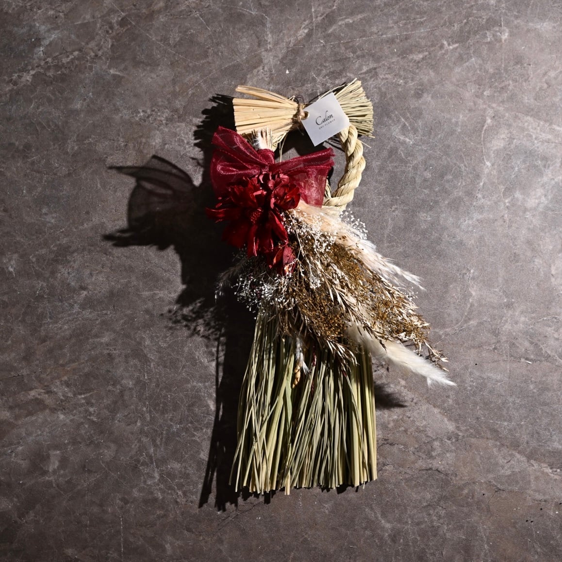 新潟県十日町市で収穫された高品質な稲わらと、Calon DRY FLOWERが厳選したドライフラワーを使用した、特別なしめ縄です。