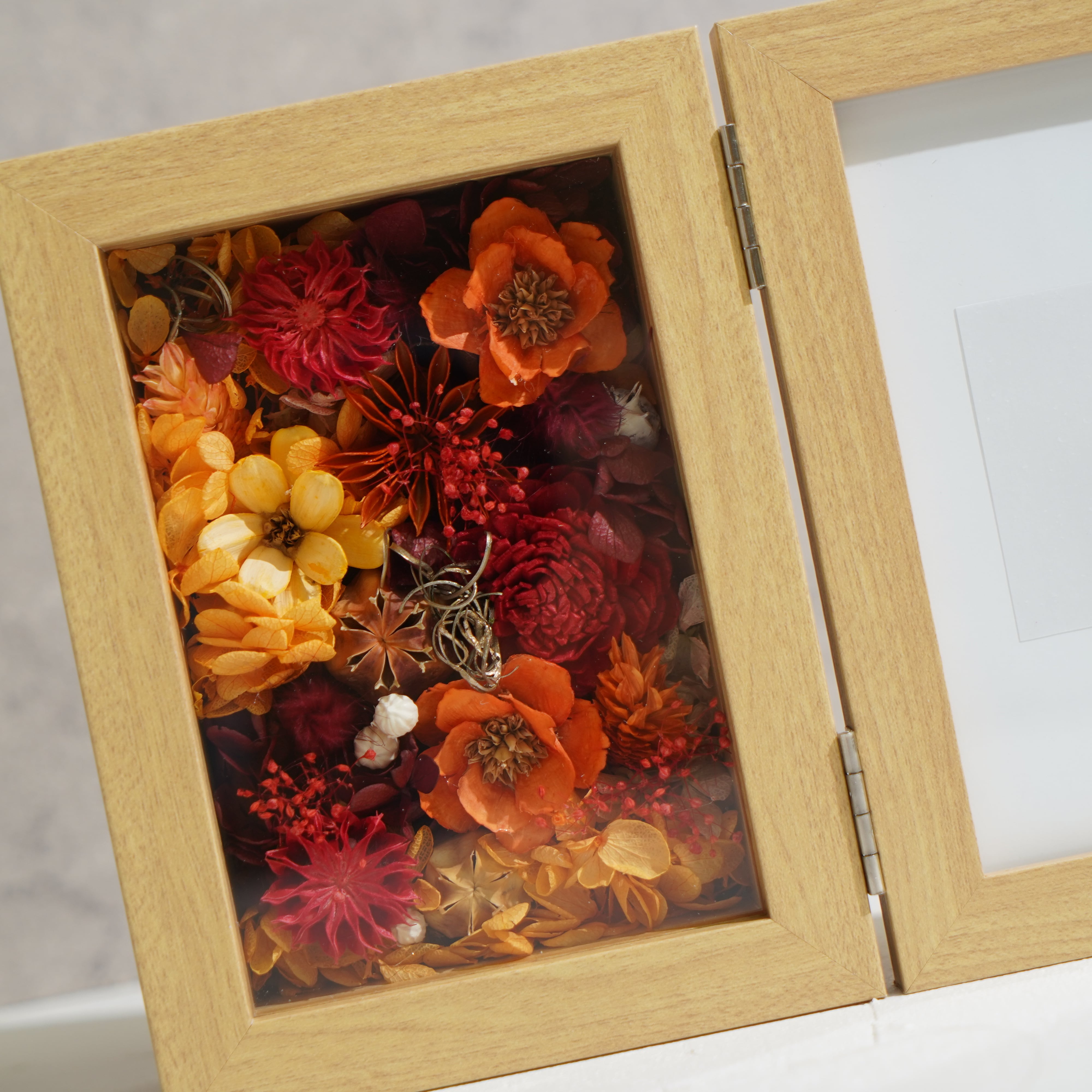 ドライフラワーとプリザーブドフラワーを一面に敷き詰めた贅沢なデザインです。