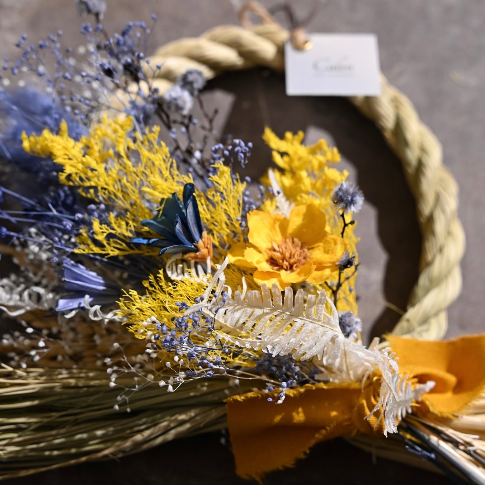 新潟県十日町市で収穫された高品質な稲わらと、Calon DRY FLOWERが厳選したドライフラワーを使用した、特別なしめ縄です。