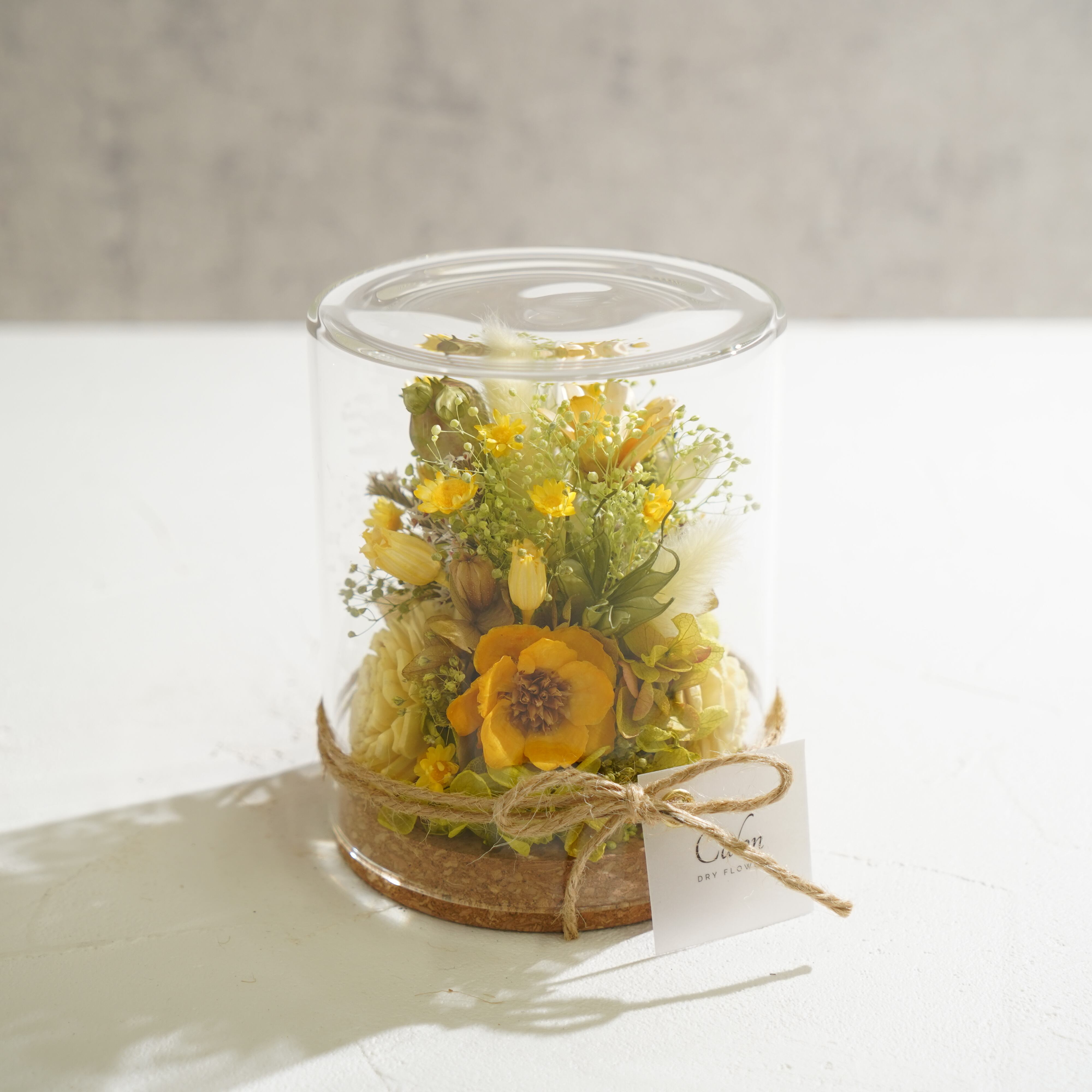 ガラスのボトルに鮮やかなドライフラワーを詰め込んだボトルフラワー。お部屋のインテリアや大切な方への贈り物にも最適です。透明ケースへお入れしてお届け致します。