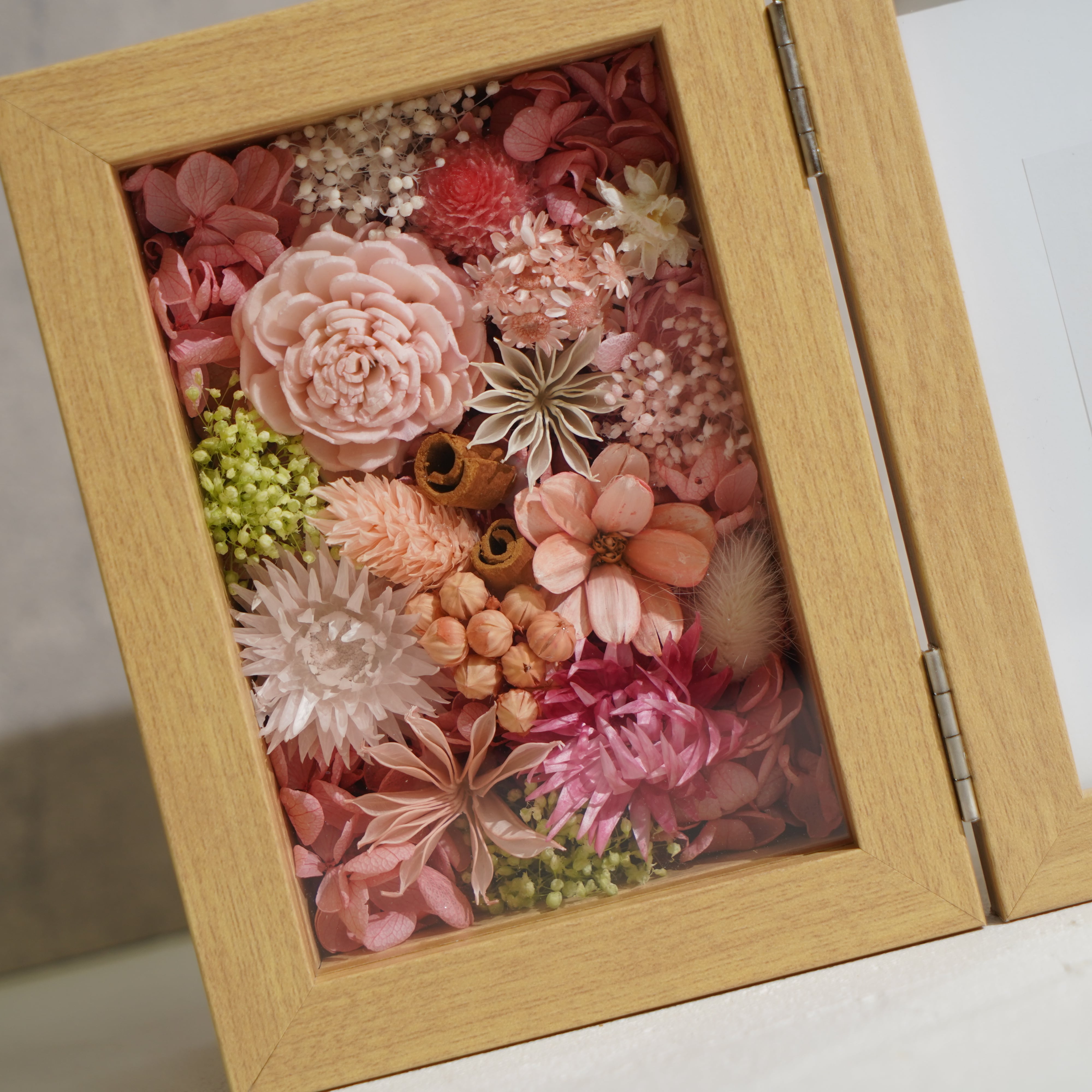 ドライフラワーとプリザーブドフラワーを一面に敷き詰めた贅沢なデザインです。