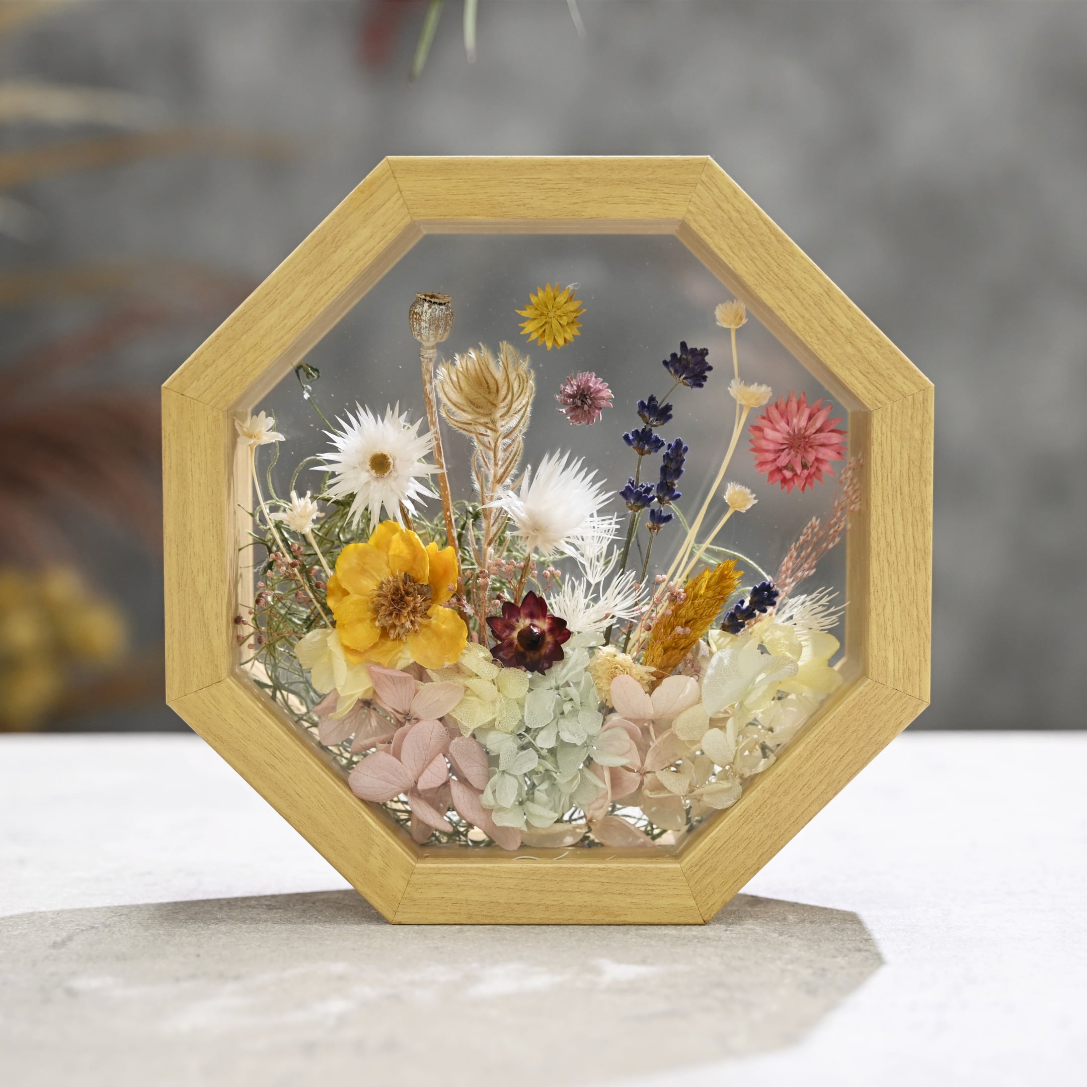 置き型木製ガラスフレームの中に鮮やかなドライフラワー、プリザーブドフラワーを閉じ込めたフレームフラワー。お手入れ不要でご自宅のインテリアやギフトにおすすめです。